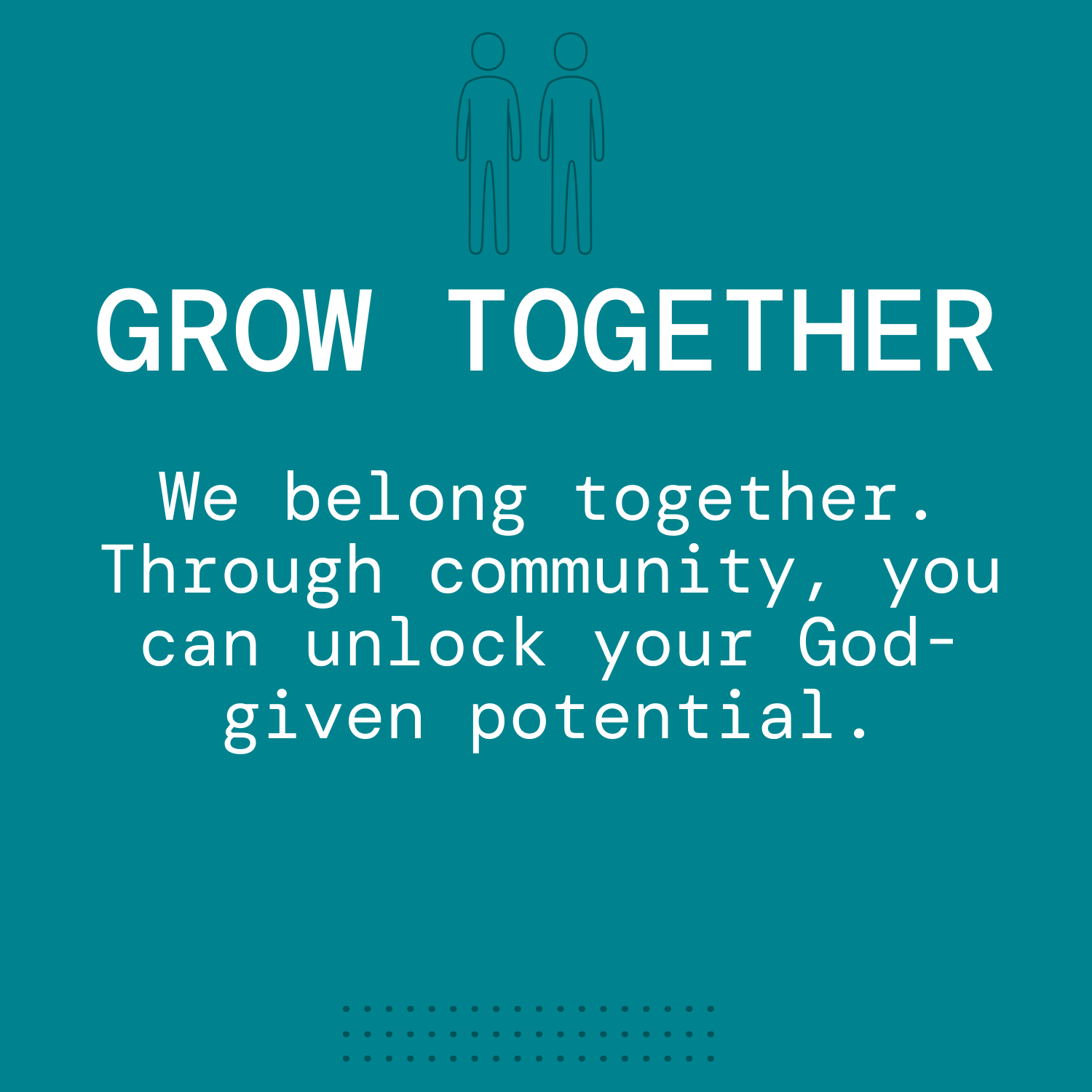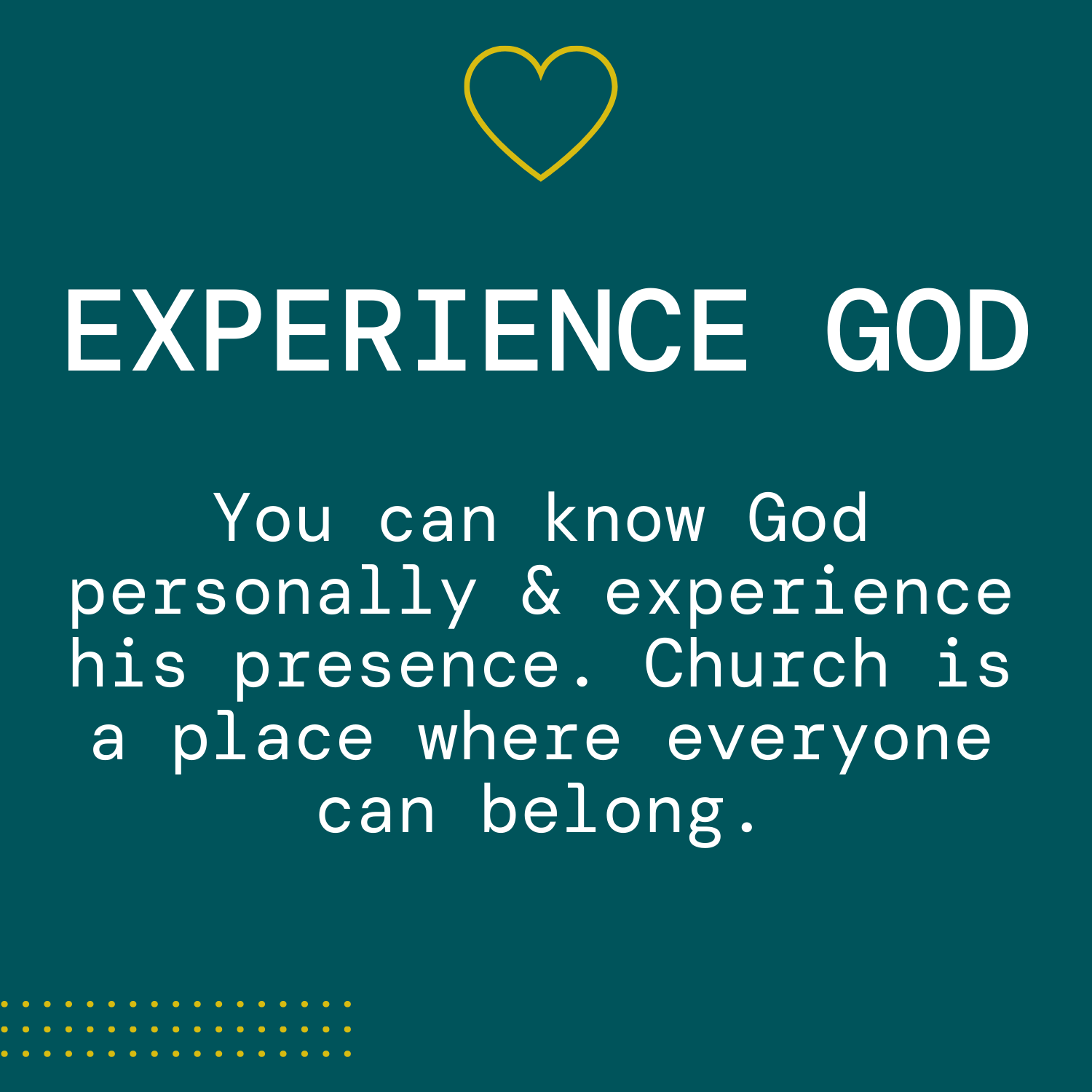 We want to help you live the life you were created for, because church is a place where everyone can experience God, grow together and serve others.